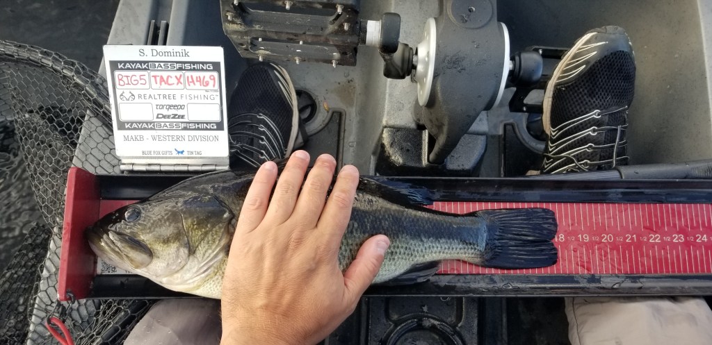 Nelson also spent some time in “da Shires” for the second Massachusetts Kayak Bassin’ Western Division Tournament trail stop. He found bass and pickerel around boulders and rock piles that were willing to take squarebill crankbait and a ned rig. There were just enough bass to put him in 3rd place. Nelson also found himself fishing in a pond in North Central MA where he had bass and pickerel relating to wood, catching them on chatter bait and weightless plastic. Trolling with a silver and black Rapala also brought in a rainbow and a brown trout, after he’d seen some fish surface. Changing gears Nelson fished for about an hour while his daughter was at soccer at a pond/river with class earthworms, trying to add species to the Jigs & Bigs Multispecies Tournament. He landed white perch, bluegill, and bullhead.