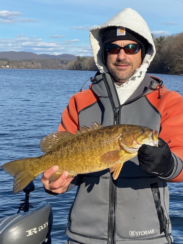 Tim got out on the Connecticut River the first weekend in December. He said the water temperature was a balmy 36 degrees. The bite was a little slow until he hit a bite window around noon. They boated 16 smallies ranging from a 21.5 inch 5 poinder to a 1 pound. He said the majority of the fish were in the 3-4 lb range and the swim bait and blade bait brought them boatside.