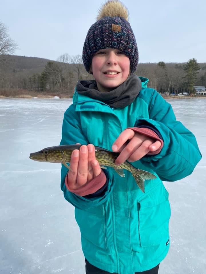 Nelson was also excited to have gotten out with his regular crew and Shawn and Bobby this past Sunday on a small pond where they were standing on 8-9 inches of ice. We usually go through several dozen shiners at this pond which is why we always take the kids there. He reported that most of the action comes from small pickerel. He said that although they had enough flags to keep the kids busy, this trip was about quality not quantity. Except, of course, for one of the fish that I caught which was possibly the smallest Pickerel I have ever held in my hand.