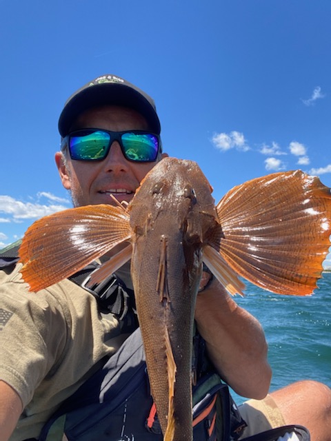 Nelson said that the fishing was okay, and that multi-species was the theme.. It certainly wasn’t lights out fishing but they were biting and you never knew what you were going to hook up with. He landed several fluke (summer flounder), sea robins, scup (porgie), black sea bass, and some chub mackerel. Nelson said that most of his fish were caught on a jig and teaser rig, very similar to a drop shot rig. The chub mackerel were caught on small shiny metals like a deadly dick or cast master. Saltwater fishing from a kayak is so much fun but you do have to be careful with the weather, especially the wind. Listen to this week’s Jigs and Bigs podcast to get some tips on how to stay safe and make your trip enjoyable. Good luck out there!!