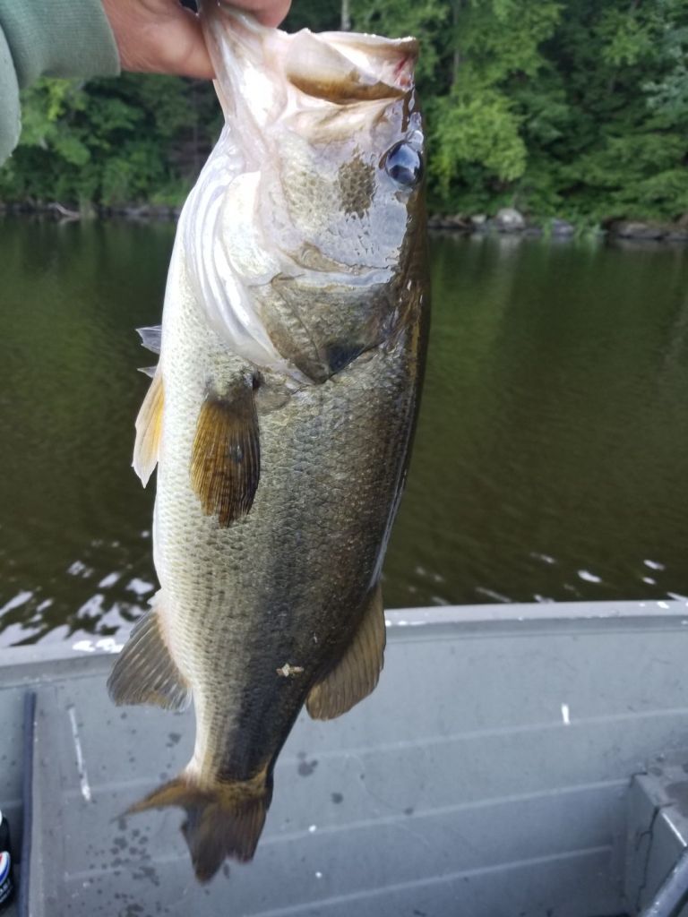 Jerry fished on a smaller 100 acre pond in the Berkshires for only four hours on Saturday morning where the water was 76 degrees and there was clear visibility six to eight feet. He said that this particular pond had a great amount of weeds. Jerry reported that the bass were on fire for an hour or so, until the wind picked up out of the North. He had success fishing finesse baits in natural colors, catching a mixed bag of largemouth and smallmouth along with only two pickerel and a bluegill during his short morning outing.