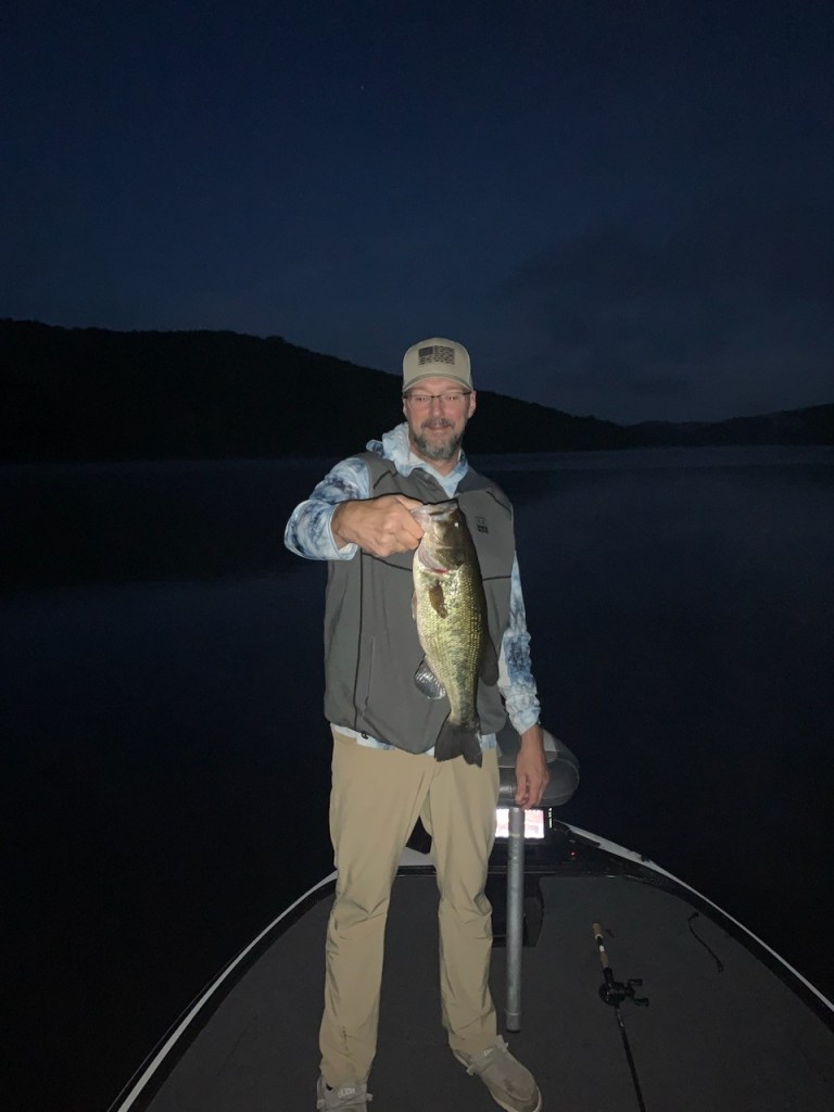 Andy got out with Shawn and fished Littleville Lake in Worthington early Saturday morning, hitting the water well before sunrise and yielding good results. He said that just after launching the boat they had the first fish of the day on a topwater strike. Andy reported that the water was 71 degrees and calm making it ideal for the plopper. They caught a few more on those but as the day wore on the fish started to tuck into the shade and they had to finesse them out of those areas and along weed lines with soft plastics. There were very few people on the water and as the days drag on I can only assume those numbers will dwindle. Good news for anyone fishing there, we could tell by the fish we caught they were starting to put some weight back on for the long New England winter.
