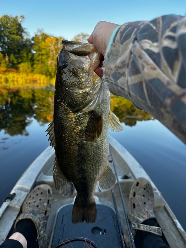 Nelson’s last outing was to a new pond where he found bass around small isolated patches of lily pads including a GIANT that broke me off in the weeds. It was a weightless soft stick bait dropped on the edge of the pads that was getting some bites but as light diminished and into the dark he had a great hollow body frog bite around the edge and through the lily pads. Nelson pointed out that some of your best chances to catch a giant bass will be at night when they are more active. Don’t be afraid of getting out there at night. I will suggest that you go to a pond that you are familiar with for your first few times. Fishing at night can be fun and the chances of a big bass are great but it has its challenges.Fishing has been pretty good lately and should only get better as temperatures start to drop. Get out there before it’s too cold.