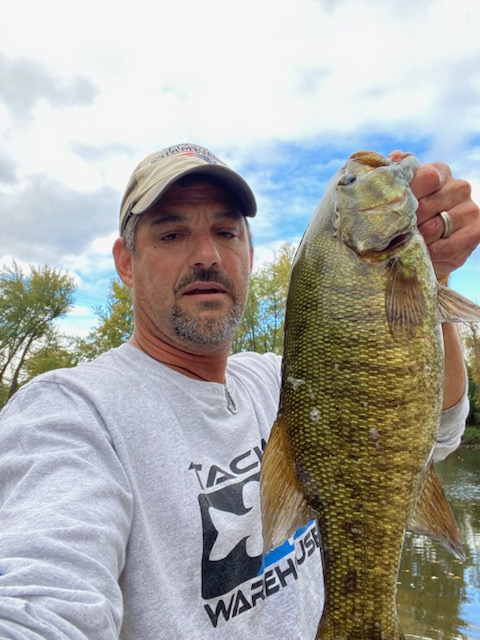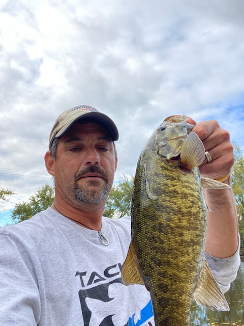 Tim had a club tourney on the Ct river Oxbow section. He said he ran north a little ways and hit a cut between an island where there was a good amount of current and water temperatures were in the upper 50’s. Tim threw a topwater which elicited one missed blow up, and then tossed a spinnerbait, jerkbait, and ned rigs around wood with no takers. Next he decided to change tactics, making his way across the river to the sunny shoreline where he started catching keeper smallies on a jerkbait; specifically on the up current side of structure. Tim said that he managed to boat his initial limit going down the shoreline hitting all the wood he could find with ned rigs and jerkbait. He ended up getting to one tree where he saids he noticed fish stacked up and moving on the active target. He boated 15 + fish off one tree, upgrading his limit. I would land a fish and immediately toss out another bait and let it dead stick while I weighed and culled my fish. I’d pick up my line and there’d be another fish on! I did that 5-6 times! I probably spent too much time there, don’t leave fish to find fish!! Ended up in fifth for the day! 18 smallies, 1 largie, 2 big perch, and a fall fish.