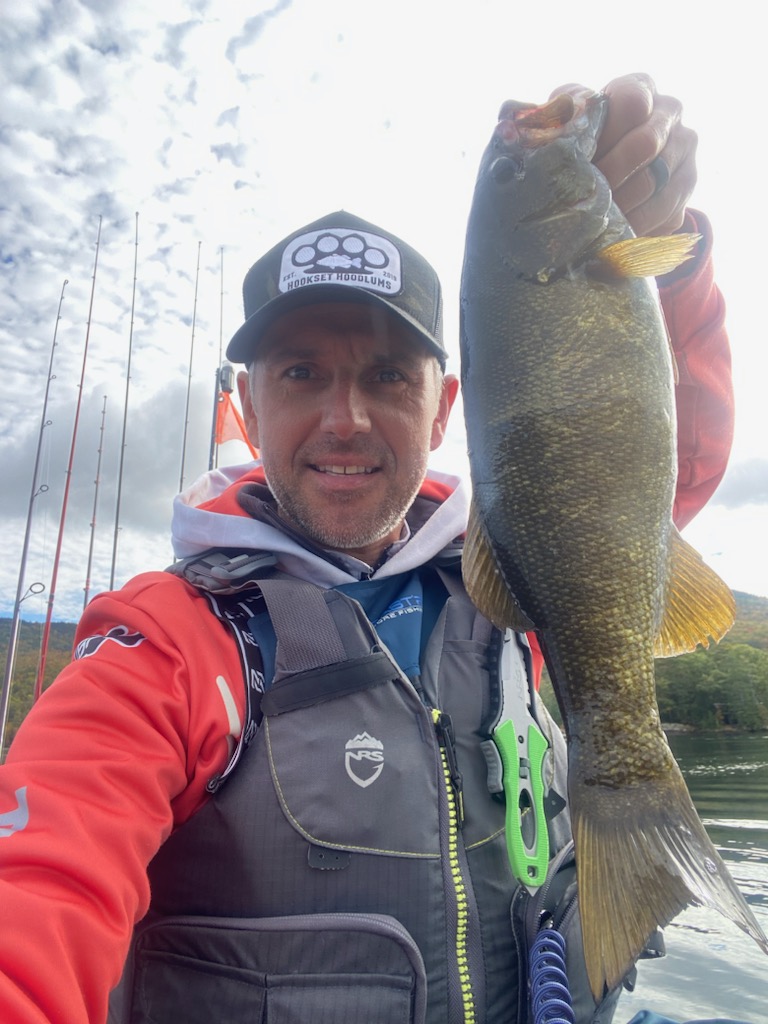 Nelson got out on Lake George in upstate New York for the Elite Kayak Fishing 2 day Championship where the water temperatures were in the upper 50’s and lower 60’s. He said that this was my first time fishing Lake George so he planned an extra day of prefishing. Although Nelson said the fishing was tough and it took him a little while, he finally found some bass in deep water; really deep water. All of the fish Nelson caught in four days came from 35 – 55 feet of water including a keeper bass at 55 feet. He also caught a 23″ pickerel at 53 feet and said that most of the better sized bass came from 35-40 feet. The waters of Lake George are extremely clear with visibilities reaching to 20 feet or more and with the amount of boat traffic and fishing pressure that it receives it’s no surprise that the fish were that deep.