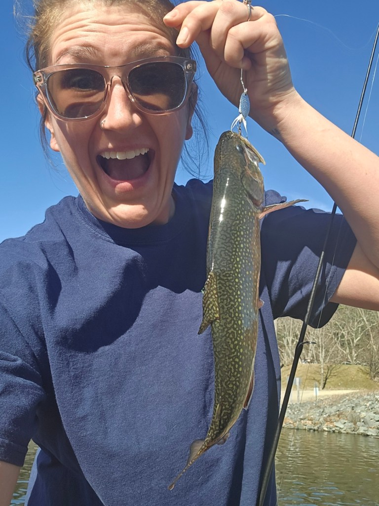 I threw that lure for a while, missed 2 other bites and then it all stopped. Next was a neon green rooster tail, which also yielded nothing, but when I switched to the white one I caught a nice brookie! That was my last bite of the day I fished for maybe another half hour and after taking off the rooster tail tried an all gold Thomas but no stabs. The water levesl are really hight and the water temps are still cold especially from all the rain, so if you can get a sunny day closer to shore you might find some fish!