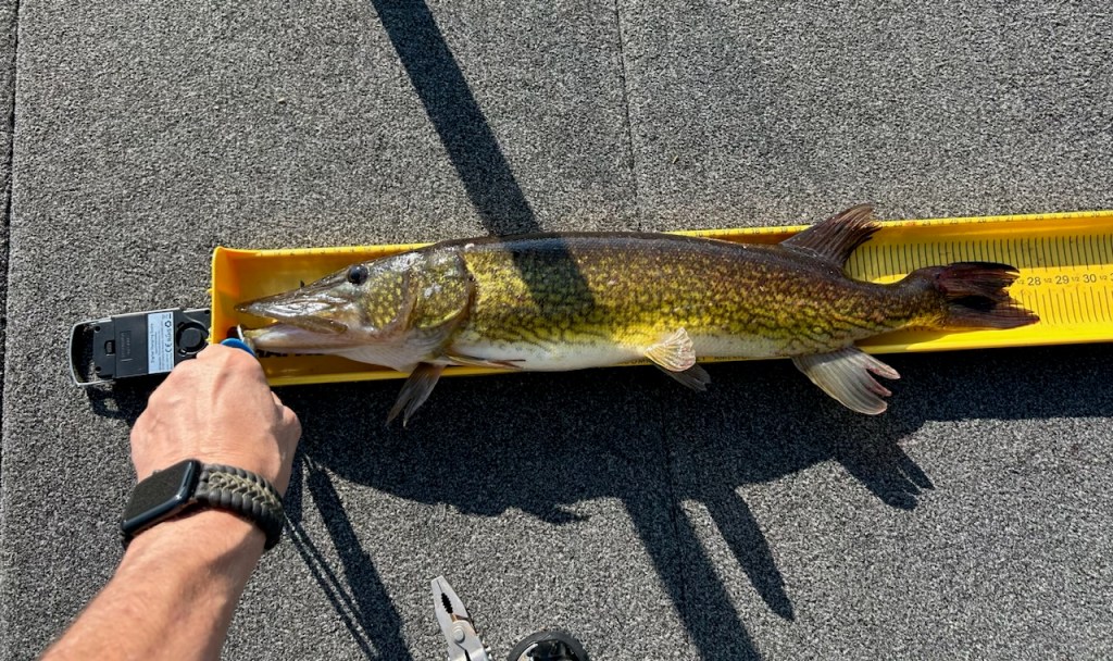Andy was finally able to get out this season with a quick send on Otis where the water temperature was 69 degrees and so was the air with clear skies and slight wind. His his first fish of the year was a good one; a 6.2 lb. pickerel who was shallow under some branches. Andy said he hit a soft plastic and took off!! After a good fight while simultaneously retrieving my net I was reminded of why I love getting out on the water. As they say ” the tug IS the drug”.